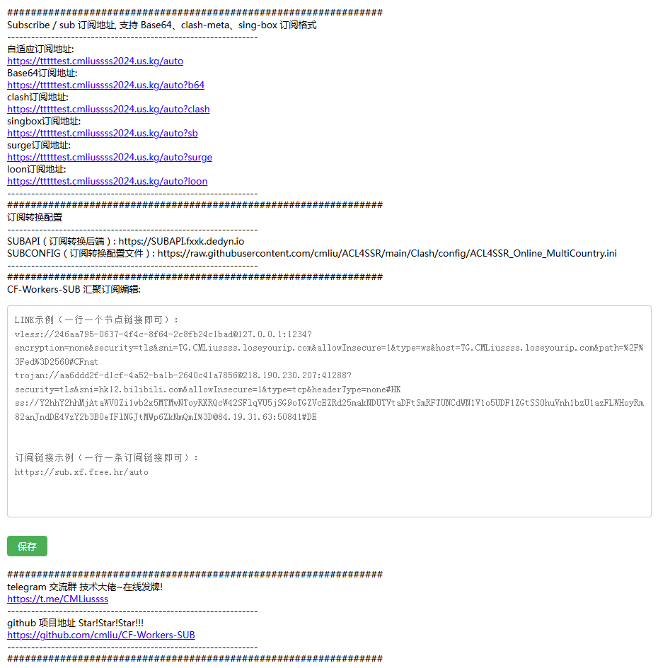 https://sub.cmliussss.workers.dev/auto,添加你的自建节点链接和机场订阅链接,确保每行一个链接,例如:vless://b7a392e2-4ef0-4496-90bc-1c37bb234904@cf.090227.xyz:443?encryption=none&security=tls&sni=edgetunnel-2z2.pages.dev&fp=random&type=ws&host=edgetunnel-2z2.pages.dev&path=%2F%3Fed%3D2048#%E5%8A%A0%E5%85%A5%E6%88%91%E7%9A%84%E9%A2%91%E9%81%93t.me%2FCMLiussss%E8%A7%A3%E9%94%81%E6%9B%B4%E5%A4%9A%E4%BC%98%E9%80%89%E8%8A%82%E7%82%B9 vmess://ew0KICAidiI6ICIyIiwNCiAgInBzIjogIuWKoOWFpeaIkeeahOmikemBk3QubWUvQ01MaXVzc3Nz6Kej6ZSB5pu05aSa5LyY6YCJ6IqC54K5PuiLseWbvSDlgKvmlabph5Hono3ln44iLA0KICAiYWRkIjogImNmLjA5MDIyNy54eXoiLA0KICAicG9ydCI6ICI4NDQzIiwNCiAgImlkIjogIjAzZmNjNjE4LWI5M2QtNjc5Ni02YWVkLThhMzhjOTc1ZDU4MSIsDQogICJhaWQiOiAiMCIsDQogICJzY3kiOiAiYXV0byIsDQogICJuZXQiOiAid3MiLA0KICAidHlwZSI6ICJub25lIiwNCiAgImhvc3QiOiAicHBmdjJ0bDl2ZW9qZC1tYWlsbGF6eS5wYWdlcy5kZXYiLA0KICAicGF0aCI6ICIvamFkZXIuZnVuOjQ0My9saW5rdndzIiwNCiAgInRscyI6ICJ0bHMiLA0KICAic25pIjogInBwZnYydGw5dmVvamQtbWFpbGxhenkucGFnZXMuZGV2IiwNCiAgImFscG4iOiAiIiwNCiAgImZwIjogIiINCn0= https://sub.xf.free.hr/auto https://hy2sub.pages.dev